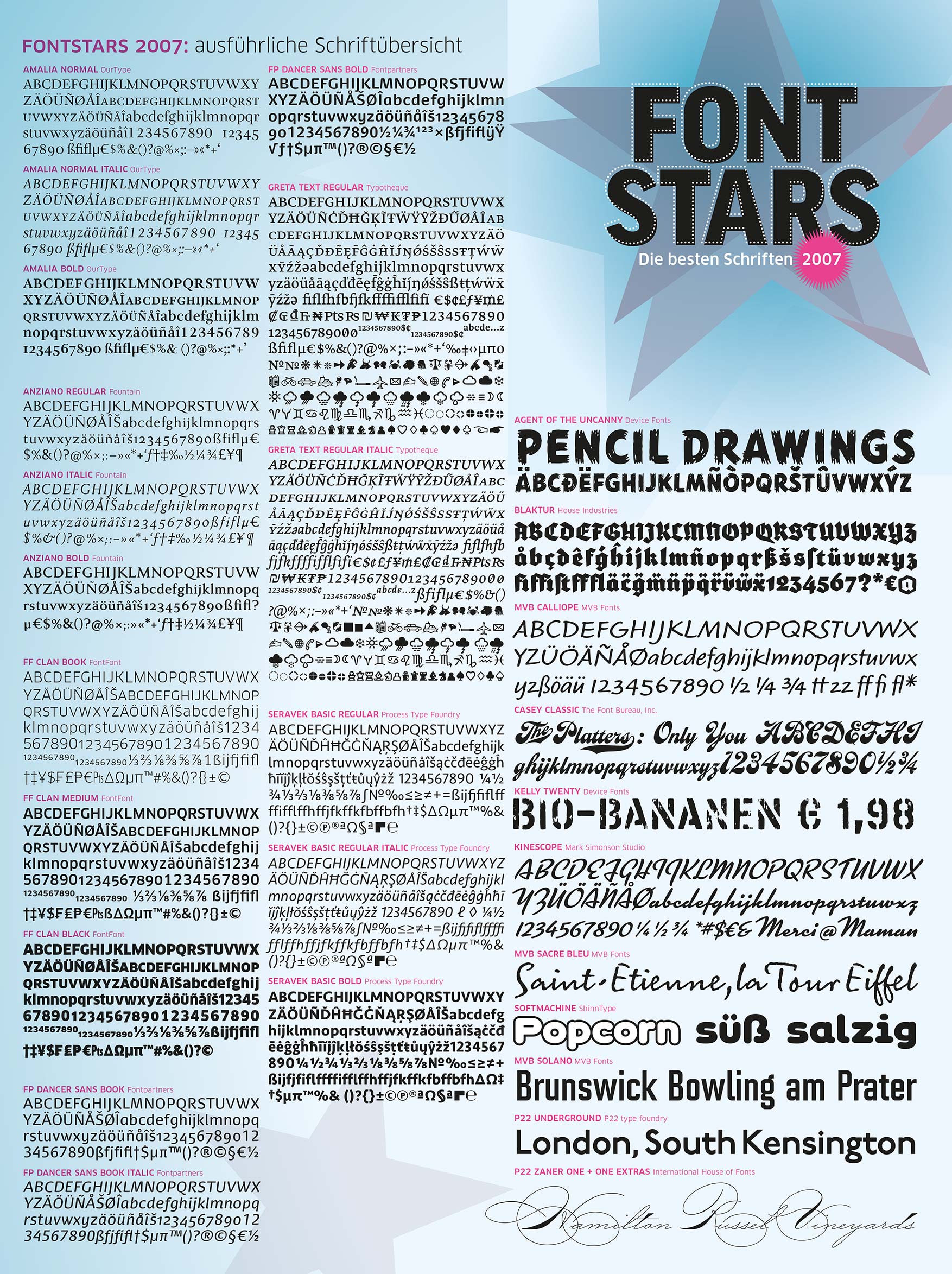 Ich hatte mir fest vorgenommen, erstmals eine Best of der neu erschienenen Schriften aufzustellen. Was dagegen spricht? Man ist mir zuvor gekommen! An sich ist das auch kein Problem, jedoch deckt sich jene vorgedrängelte Liste im Kern doch sehr mit meiner eigenen, die dort gezeigten Displayfonts sowie die fehlende Meta Serif einmal ausgenommen. Die Rede ist von FontShops „Fontstars – Die besten Schriften 2007“. Gut, dann spar ich mir eben meine eigenen Jahresendcharts und werfe stattdessen einen intensiven Blick auf die Fontstars, die es im übrigen auch als kaufbares Schriftenpaket gibt. Wollen wir doch mal sehen …