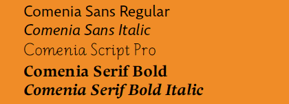Die Comenia besteht aus 19 Einzelschnitten: Regular, Italic, Bold und Bold Italic der Serifenversion, die selben Schnitte plus einer Medium und Medium Italic für je die serifenlose Version und die Sans Condensed sowie drei Script-Schnitte. Es wurde beispielsweise darauf geachtet, dass die Sans Serif mit der Serif die Höhen der Groß- und Kleinbuchstaben gemein haben sowie die Längen der Ober- und Unterlängen. Dieses umfangreiche typografische System bedurfte gleich drei Schriftgestalter, die sich die Erschaffung neuer ästhetischer Standards mit verbesserten Leseeigenschaften speziell für Schüler und Studenten zum Ziel setzten. Dem Gestaltungsprozess gingen umfangreichen Forschungsaktivitäten im Bereich der Ergonomie des Schreibens, Lesens, Druckens und Digital Publishings sowie der historischen Schriftentwicklung voraus. Eine sehr gelungene umfangreiche Schriftfamilie.