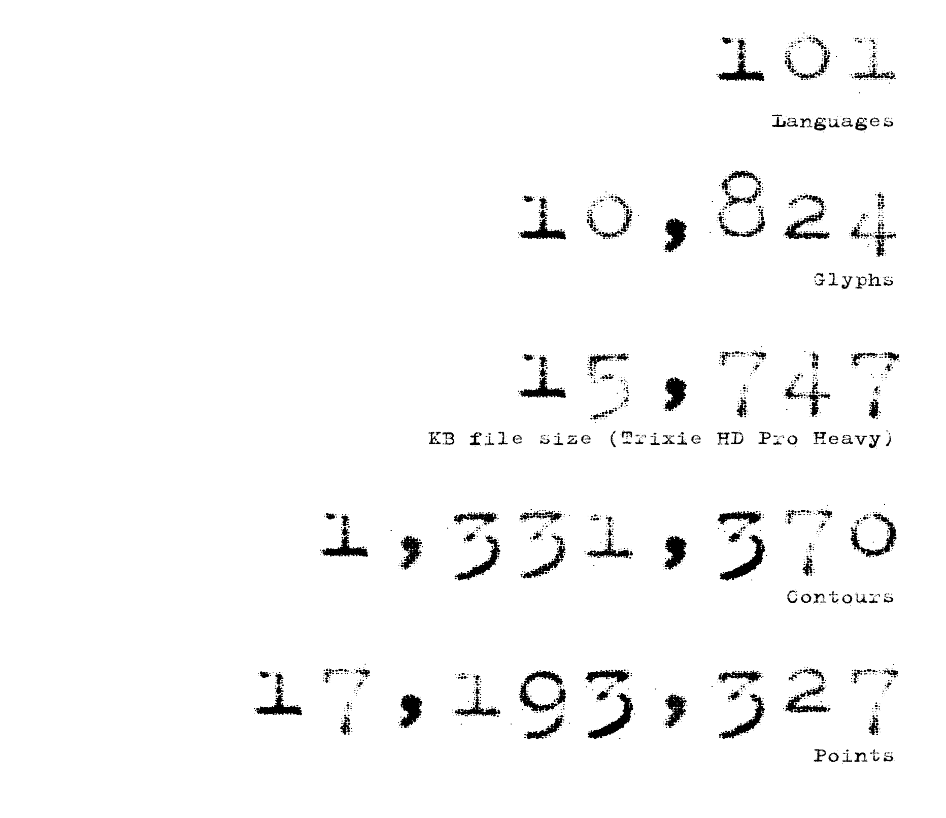 Die Trixie ist die wohl berühmteste digitale Schreibmaschinenschrift der Welt und bereits 17 Jahre alt. 2008 wurde sie unter Berücksichtigung der Möglichkeiten des OpenType-Formats einer kompletten Überarbeitung unterzogen. Was wir heute vor uns haben, ist quasi eine völlig neue Schrift und gehört daher zu Recht in diese Top Ten der Neuerscheinungen. Sie besteht aus über 14 Millionen Punkten und derart vielen Dateiinformationen, dass jeder der Pro-Fonts je eine Dateigröße von über 13 MB hat – Rekord! Ihr Gestalter ließ die Punkte automatisch von einem Skript zählen. Es benötigte dafür sieben Stunden. Die unzähligen Alternativen (sieben pro Buchstabe in der FF Trixie HD) und OpenType-Features wie zum Beispiel automatisches Grundlinienhüpfen oder Farbbandeffekte lassen das typografische Herz erfreuen. Erik van Blokland hat hier die perfekte digitale Imperfektion erschaffen.