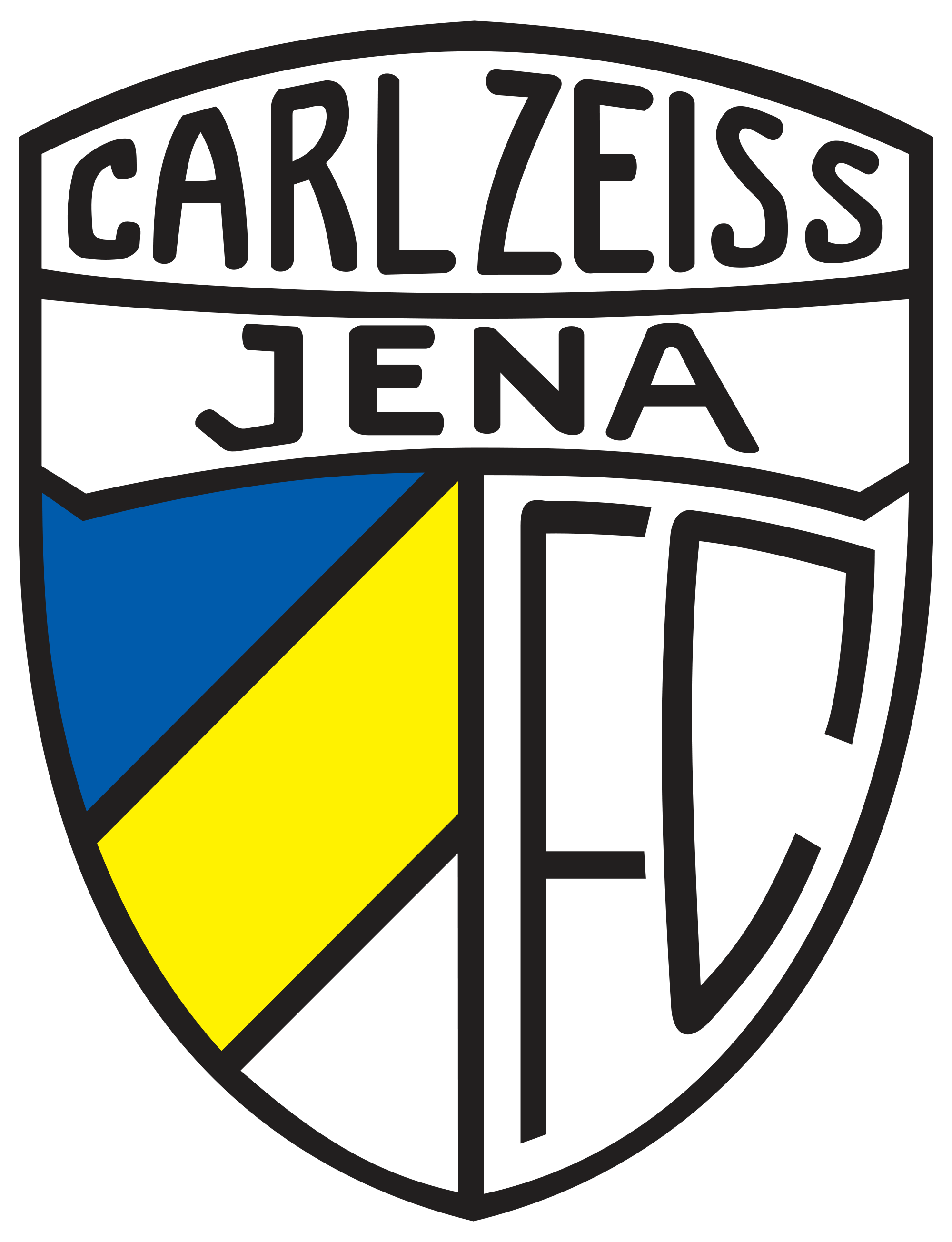 9. Fußballclub Carl Zeiss Jena – Stadtfarben = Vereinsfarben. Diese Gleichung gilt auch in der Thüringer Universitätsstadt. Blau, gelb und weiß sind die tragenden Elemente des dreifachen DDR-Meisters, wobei mir das farblose Weiß zu sehr überwiegt. Leider erinnert das Vereinssymbol zu stark an das alte Logo des Namensgebers Carl Zeiss, was ich als kommerzkritischer Fußballfan nicht gut heißen kann. Auch wenn die Jenaer tatsächlich eine typische Betriebssportgemeinschaft, also gespickt mit Angestellten des stiftenden Unternehmens war. Hab ja selbst mal in einer BSG gespielt …